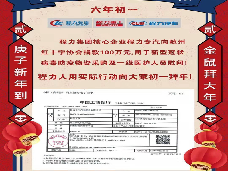 程力專用汽車股份有限公司捐款100萬元用于新冠狀肺炎防控